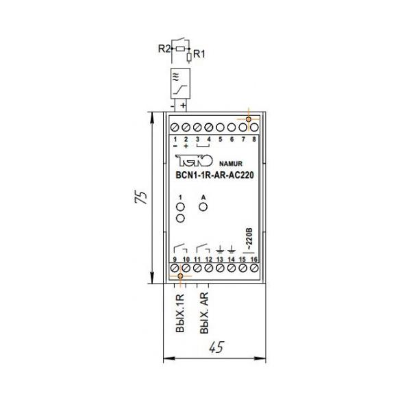 Блок сопряжения BC N1-1R-AR-AC220-C предназначен для питания индуктивных бесконтактных особовзрывобезопасных датчиков и преобразования слаботочного аналогового сигнала, поступающего от датчика, в сигнал оптрона для управления исполнительными устройствами.Блок сопряжения обеспечивает:1. Гальваническую развязку датчика с исполнительным устройством.2. Преобразование слаботочного сигнала датчика в выходной сигнал оптрона для управления исполнительным устройством с одновременной индикацией замкнутого состояния выхода.3. Инверсию состояния выхода канала установкой перемычки.4. Контроль исправности датчика и линии связи с датчиком (КЗ, обрыв провода).5. Световую индикацию и размыкание выходов рабочего канала при обнаружении в ней неисправности.6. Формирование сигнала “АВАРИЯ” и размыкание контактов аварийного канала при неисправности в рабочем канале.Сертификат соответствия № РОСС RU.ГБ04.В01396 от 21.04.2010г.Разрешение Гостехнадзора России № РРС 00-041196 от 22.11.2010г.