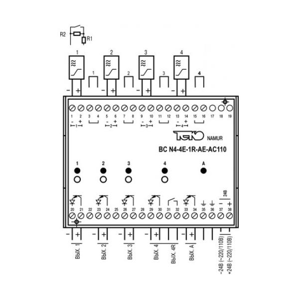 Блок сопряжения BC N4-4E-1R-AE-AC110 предназначен для питания индуктивных бесконтактных особовзрывобезопасных датчиков и преобразования слаботочного аналогового сигнала, поступающего от датчика, в сигнал оптрона для управления исполнительными устройствами.Блок сопряжения обеспечивает:1. Гальваническую развязку датчика с исполнительным устройством.2. Преобразование слаботочного сигнала датчика в выходной сигнал оптрона для управления исполнительным устройством с одновременной индикацией замкнутого состояния выхода.3. Инверсию состояния выхода канала установкой перемычки.4. Контроль исправности датчика и линии связи с датчиком (КЗ, обрыв провода).5. Световую индикацию и размыкание выходов рабочего канала при обнаружении в ней неисправности.6. Формирование сигнала “АВАРИЯ” и размыкание контактов аварийного канала при неисправности в рабочем канале.Сертификат соответствия № РОСС RU.ГБ04.В01396 от 21.04.2010г.Разрешение Гостехнадзора России № РРС 00-041196 от 22.11.2010г.