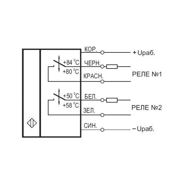 Датчик - реле температуры TT ZG71P8-94U-08-P-C-0,9 предназначен для управления системами поддержания температуры (не ниже 3ºС) в рабочих средах при пониженных температурах окружающей среды посредством подключения нагревателей. Датчик - реле температуры имеет в своем составе два независимых реле. Принцип действия: При снижении температуры контролируемой среды до 80ºС подается управляющее напряжение на обмотку реле№1, при этом замыкаются контакты реле, подключенные к чёрному и красному проводам. При повышении температуры контролируемой среды до 84ºС размыкаются контакты реле№1, подключенные к чёрному и красному проводам. При повышении температуры контролируемой среды до 58ºС подается управляющее напряжение на обмотку реле№2, при этом замыкаются контакты реле, подключенные к белому и зелёному проводам. При снижении температуры контролируемой среды до 50ºС размыкаются контакты реле№2, подключенные к белому и зелёному проводам.