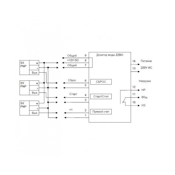 Дозатор воды (ДВ) ZZBO предназначен для цифрового подсчета единиц импульсов, поступающих на вход дозатора от концевых выключателей, кнопок, бесконтактных датчиков и включения исполнительных устройств после достижения заданного значения результатов счета. Дозатор воды имеет защиту выхода (+12V DC) от короткого замыкания (КЗ). Защита выполнена на самовосстанавливающемся предохранителе, который восстанавливается в течение не более одной минуты после устранения КЗ. Дозатор соответствует исполнению УХЛ для категории размещения 3.1 по ГОСТ 15150-69. Дозатор рекомендуется эксплуатировать при температуре окружающего воздуха от 0 до +60°C и относительной влажности 30…80%.