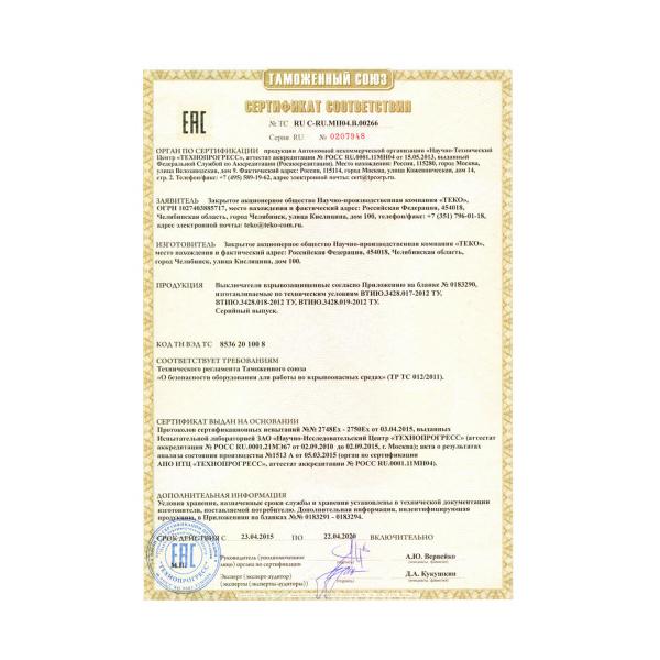 Выключатель магниточувствительный особовзрывобезопасный (датчик) MS DUG2-N-130-H предназначен для преобразования беcконтактного воздействия объекта (уровня жидкости) в электрический сигнал для управлениия исполнительным устройством, для работы в среде, не содержащей агрессивных жидкостей, газов и паров в концентрациях, приводящих к коррозии металлов или разрушению материала поплавка (вспенённый эбонит). Принцип действия основан на замыкании контактов геркона, находящегося в штанге выключателя, под действием постоянного магнита, встроенного в поплавок. Изделие обеспечивает переключение контактов геркона при уровне жидкости ниже или равном контролируемому. Возможно изменение контролируемого уровня жидкости относительно плоскости крепления выключателя, а также корректировка уровня в зависимости от плотности жидкости смещением крепежных гаек в пределах ±15 мм. Выключатель обеспечивает бесконтактную коммутацию промышленного оборудования группы I, предназначенного для подземных выработок шахт и рудников и их наземных строений, опасных по рудничному газу с возможными примесями других горючих газов или пыли в условиях особовзрывоопасной зоны, а также для оборудования группы II для применения в местах опасных по взрывоопасным газовым средам согласно ГОСТ Р МЭК 60079-0-2011 и ГОСТ Р МЭК 60079-11-2010. Выключатели относятся к особовзрывобезопасному электрооборудованию и имеют маркировку взрывозащиты по ГОСТ Р 51330.0-99 и ГОСТ Р МЭК 60079-11-2010: PO Ex ia ma I Ma/ 0 Ex ia ma IIC T6 Ga Сертификат соответствия № РОСС RU.МН04.В01226 от 17.08.2012г. Разрешение Ростехнадзора № РРС 00-049207 от 19.10.12